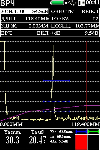 Часове Регулювання Чутливостіи (ЧРЧ) діапазон до 70 дБ, 12 дб/мкс з побудовою кривої за 32 опорними точками введеними вручну або від контрольних відбивачів